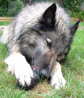 Fill the prepared Kong with the cooled stock. Leave a gap at the top (avoids spills). Place the filled Kongs in the freezer - standing upright. Allow them to set overnight. Next day you have lovely cold treats for your dog. Do not give these to your dog on carpeted or delicate surfaces, as they may leak as they warm up whilst being eaten. Ideally hose your dog off and give him the pupsickle to eat in a shady part of the garden, whilst you enjoy the fact that you don't have to mow the lawn as the sun has scorched it to a crisp! |