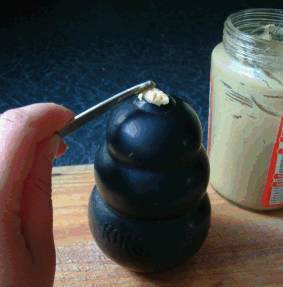 Pupsickles are frozen stuffed Kongs. Firstly you need to block the hole at the bottom of the Kong, so the liquid will stay in. To block the hole push a small amount of peanut butter into the small hole. Using your finger or the end og#f a spoon smooth off and place int he freezer to harden. (If you dog is allergic to nuts use something like liverpaste) |